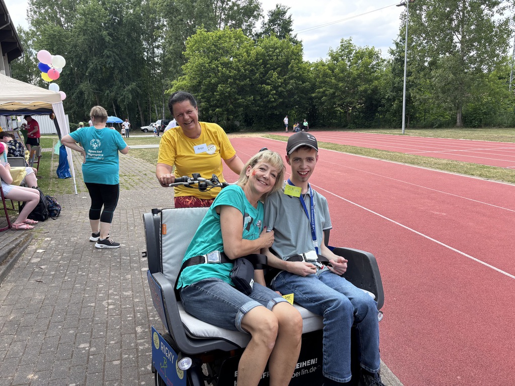 Und wir sind immer noch nicht fertig: da spontan die Therapiepferde ausfielen, half das Selbsthilfezentrum Buch mit einer Rickscha aus, die Runde um Runde um den Sportplatz fuhr.