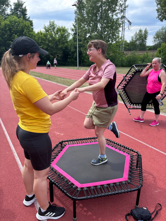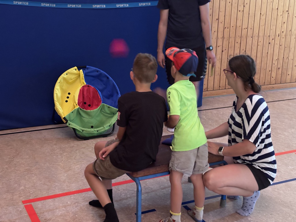 Ca. 30 junge Sportler*innen mit und ohne Behinderung erfreuten sich in der Sporthalle am Hindernisparcours von Pascal Vergin, dem Regionalleiter Liga Inklusion des Deutschen Turnerbundes, erprobten ihre Treffsicherheit auf dem Boulefeld, machten die Hüpfburg unsicher und stärkten sich zwischendurch bei Kaffee und Kuchen oder Obst und Saft, bevor es nach einer Verdauungspause am Schminktisch rasant auf der Leichtathletikanlage mit der Rikscha weiterging. Auch die Schwungtucheinlage war bei allen Teilnehmenden gleichermaßen ein Hit.